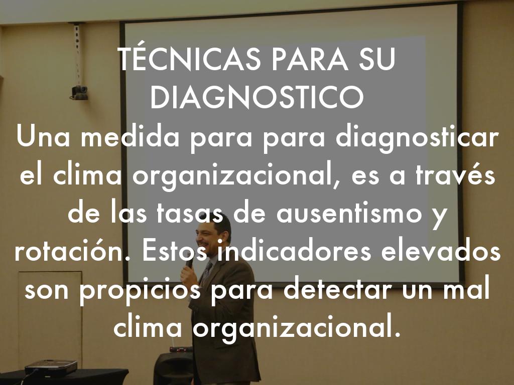 TÉCNICAS PARA SU DIAGNOSTICO Una medida para para diagnosticar el clima organizacional, es a través de las tasas de ausentismo y rotación. Estos indicadores elevados son propicios para detectar un mal clima organizacional.