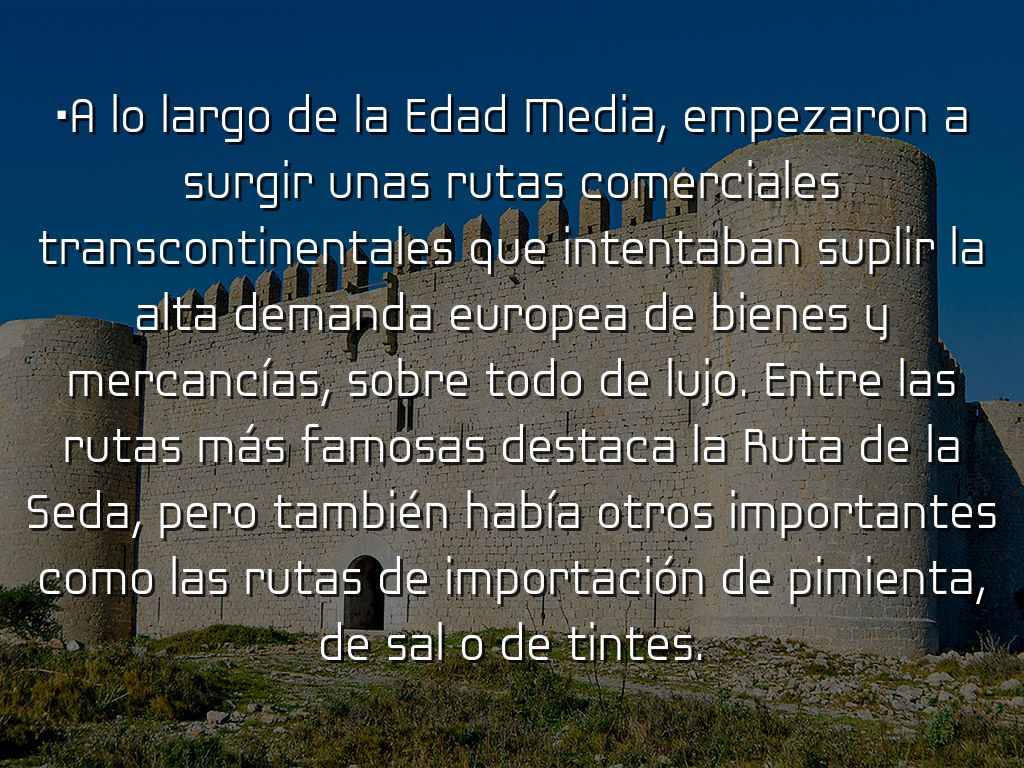 •A lo largo de la Edad Media, empezaron a surgir unas rutas comerciales transcontinentales que intentaban suplir la alta demanda europea de bienes y mercancías, sobre todo de lujo. Entre las rutas más famosas destaca la Ruta de la Seda, pero también había otros importantes como las rutas de importación de pimienta, de sal o de tintes.