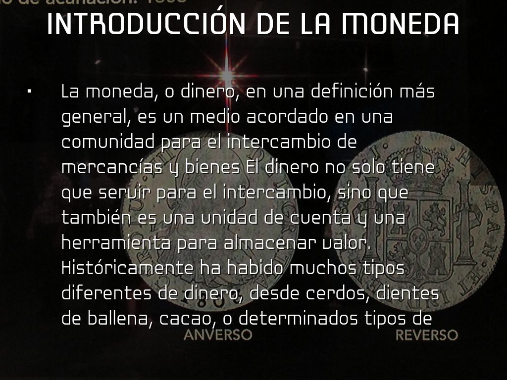 La moneda, o dinero, en una definición más general, es un medio acordado en una comunidad para el intercambio de mercancías y bienes El dinero no solo tiene que servir para el intercambio, sino que también es una unidad de cuenta y una herramienta para almacenar valor. Históricamente ha habido muchos tipos diferentes de dinero, desde cerdos, dientes de ballena, cacao, o determinados tipos de conchas marinas. Sin embargo, el más extendido sin duda a lo largo de la historia es el oro.
