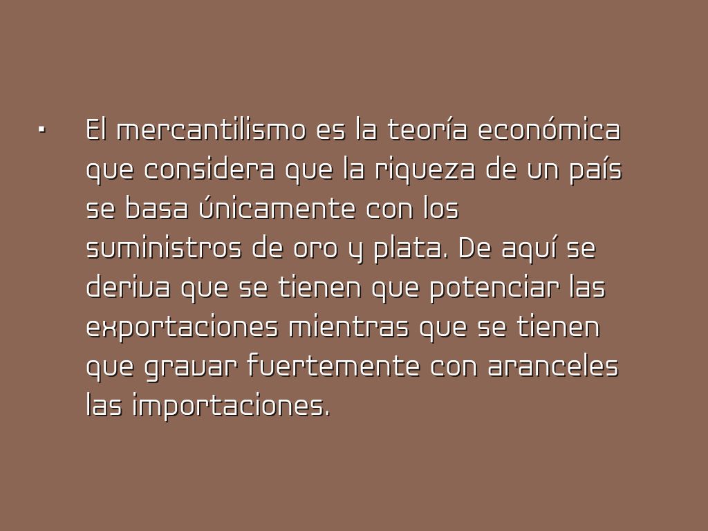 El mercantilismo es la teoría económica que considera que la riqueza de un país se basa únicamente con los suministros de oro y plata. De aquí se deriva que se tienen que potenciar las exportaciones mientras que se tienen que gravar fuertemente con aranceles las importaciones.