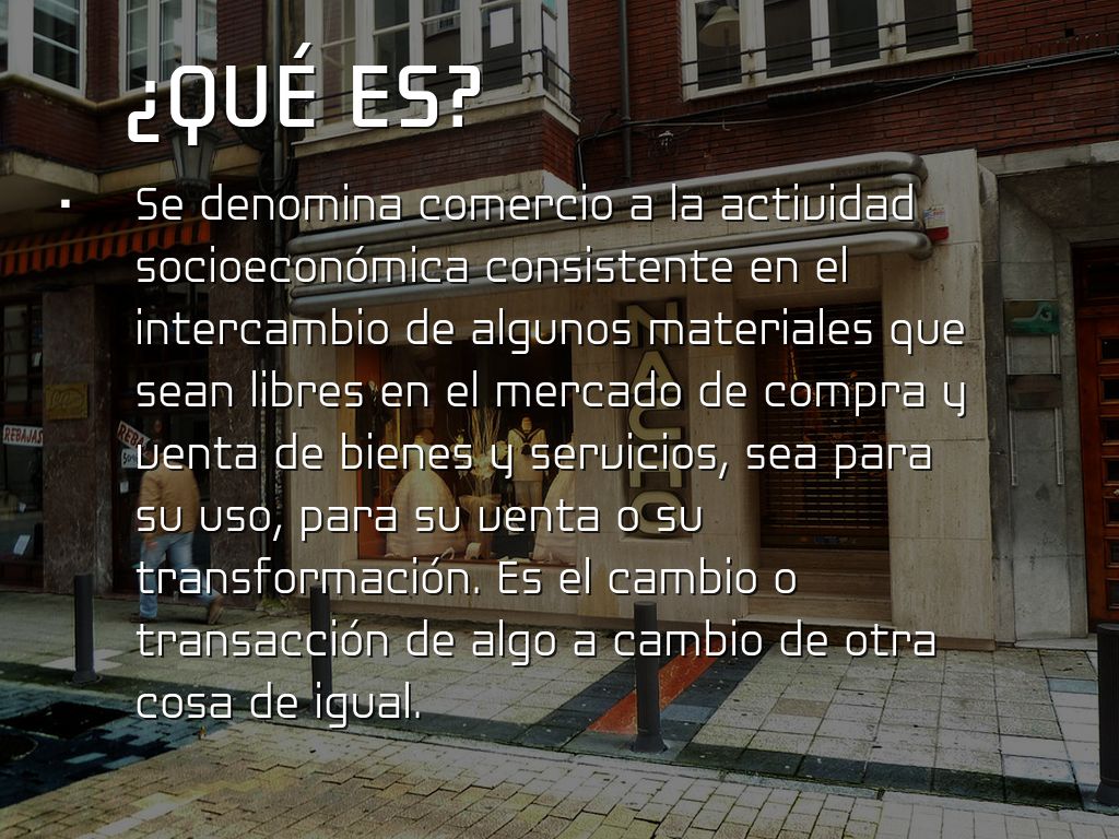 Se denomina comercio a la actividad socioeconómica consistente en el intercambio de algunos materiales que sean libres en el mercado de compra y venta de bienes y servicios, sea para su uso, para su venta o su transformación. Es el cambio o transacción de algo a cambio de otra cosa de igual.
