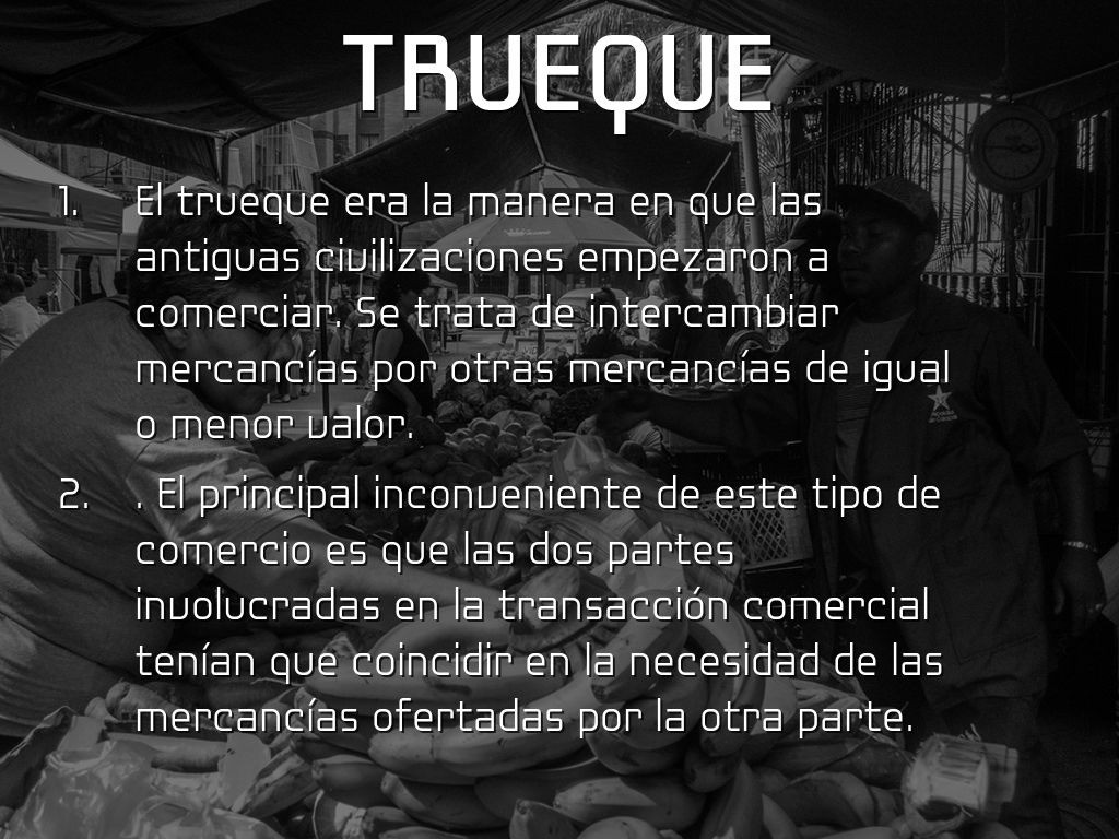 El trueque lo conocemos como sistema de comercio y fue cuando sustituía la moneda y el billete.