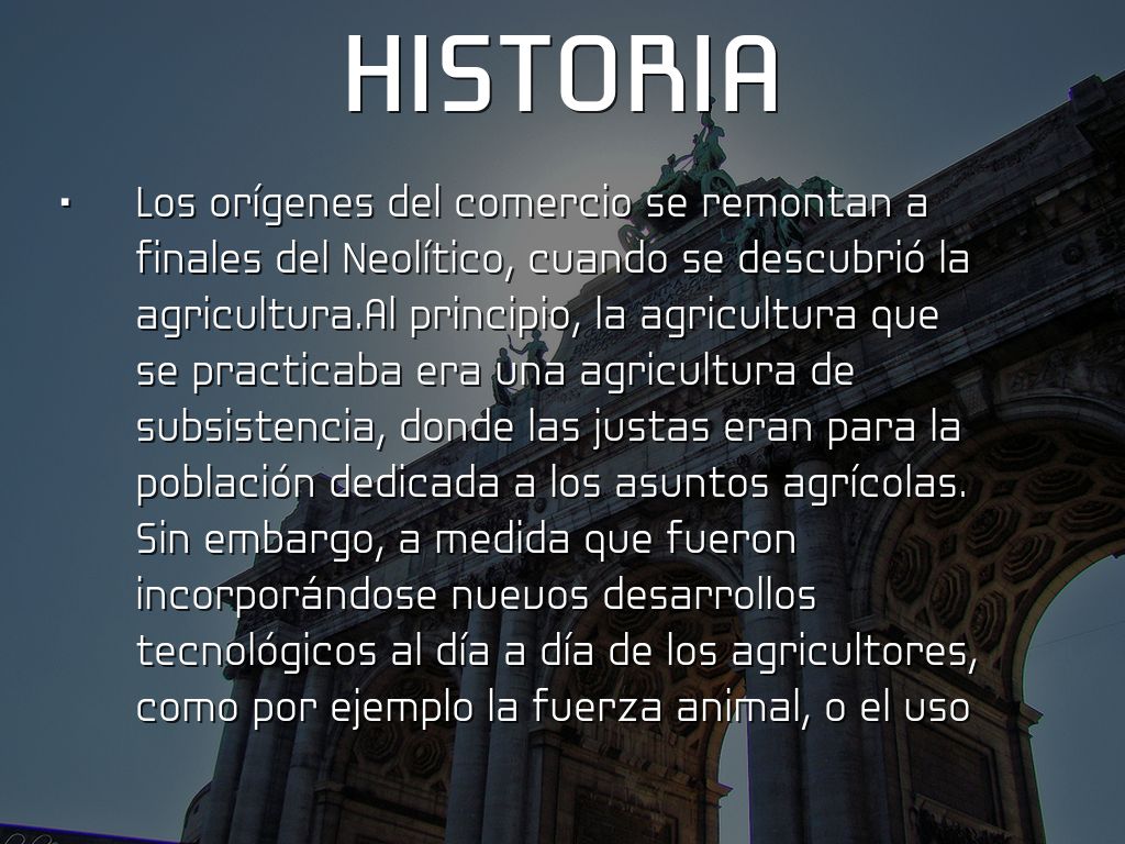 Los orígenes del comercio se remontan a finales del Neolítico, cuando se descubrió la agricultura.Al principio, la agricultura que se practicaba era una agricultura de subsistencia, donde las justas eran para la población dedicada a los asuntos agrícolas. Sin embargo, a medida que fueron incorporándose nuevos desarrollos tecnológicos al día a día de los agricultores, como por ejemplo la fuerza animal, o el uso de diferentes herramientas, las cosechas obtenidas eran cada vez mayores