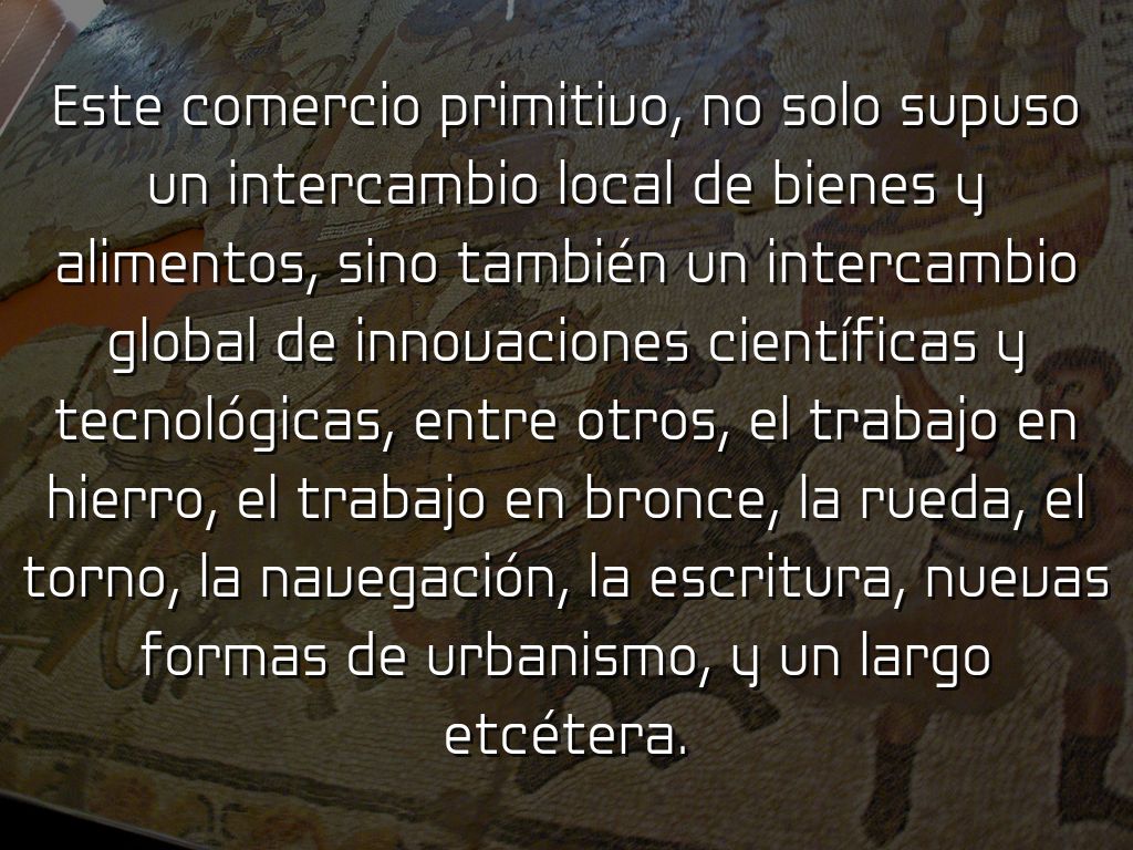Este comercio primitivo, no solo supuso un intercambio local de bienes y alimentos, sino también un intercambio global de innovaciones científicas y tecnológicas, entre otros, el trabajo en hierro, el trabajo en bronce, la rueda, el torno, la navegación, la escritura, nuevas formas de urbanismo, y un largo etcétera.