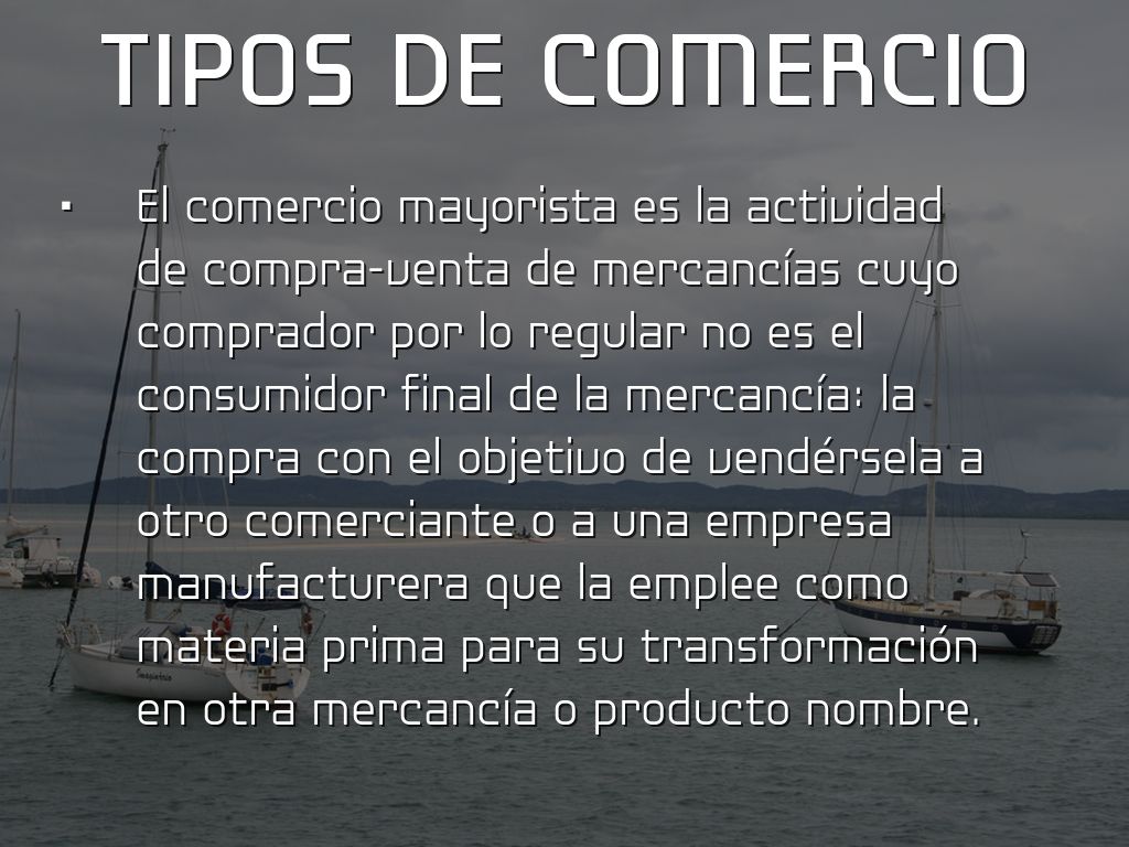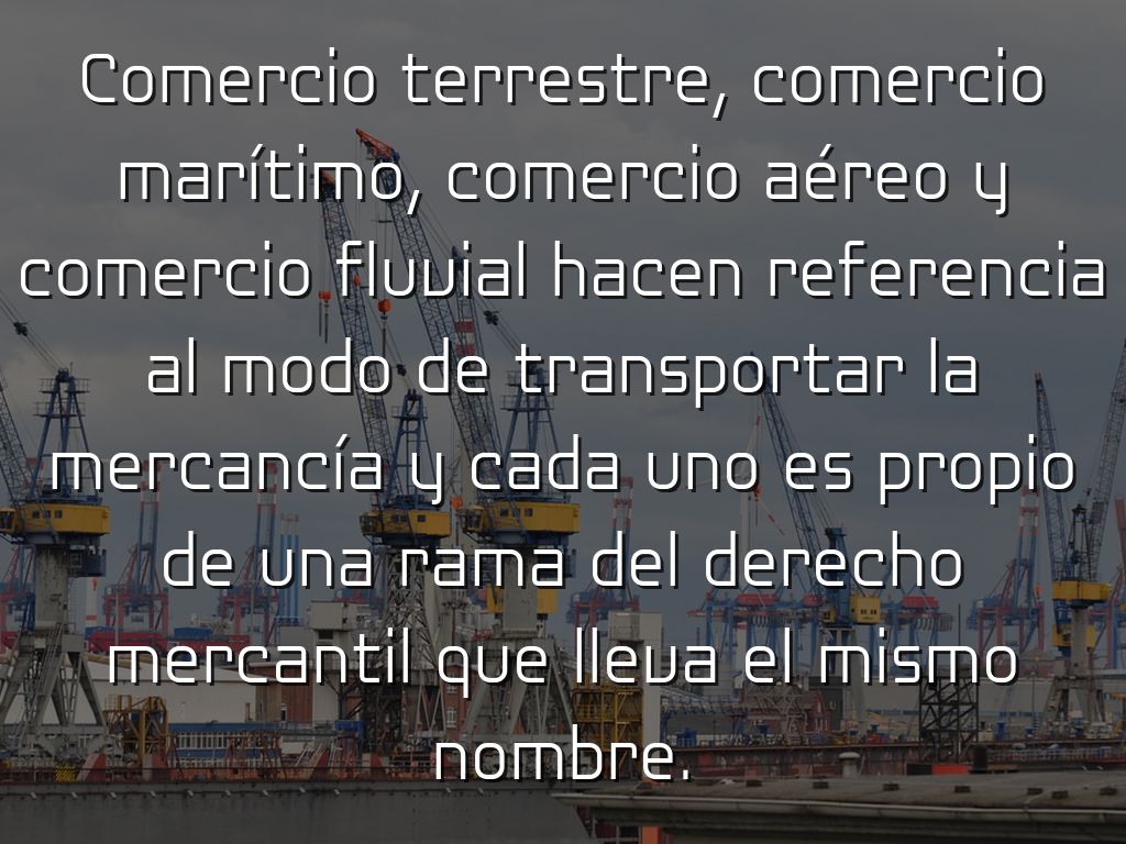 Comercio terrestre, comercio marítimo, comercio aéreo y comercio fluvial hacen referencia al modo de transportar la mercancía y cada uno es propio de una rama del derecho mercantil que lleva el mismo nombre.