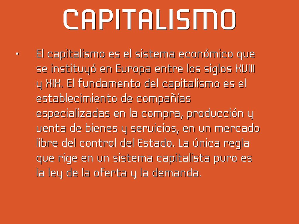 El capitalismo es el sistema económico que se instituyó en Europa entre los siglos XVIII y XIX. El fundamento del capitalismo es el establecimiento de compañías especializadas en la compra, producción y venta de bienes y servicios, en un mercado libre del control del Estado. La única regla que rige en un sistema capitalista puro es la ley de la oferta y la demanda.