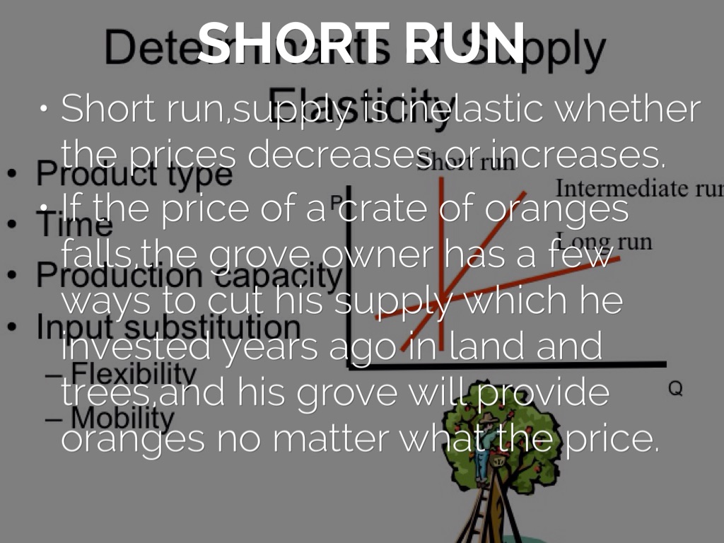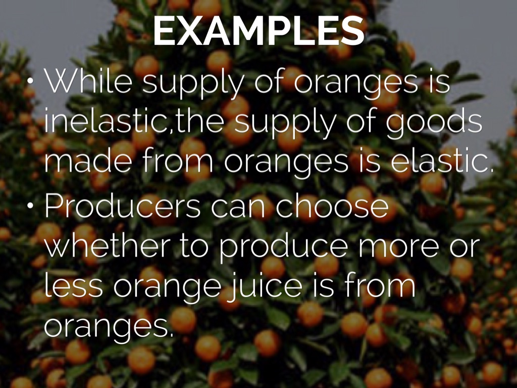 If the price of a crate of oranges falls,the grove owner has a few ways to cut his supply which he invested years ago in land and trees,and his grove will provide oranges no matter what the price.