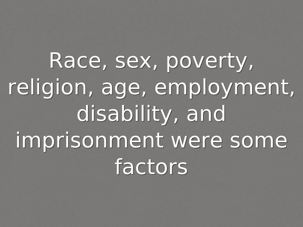 Race, sex, poverty, religion, age, employment, disability, and imprisonment were some factors
