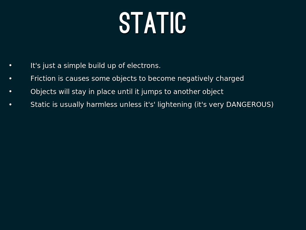 Static is usually harmless unless it's' lightening (it's very DANGEROUS)