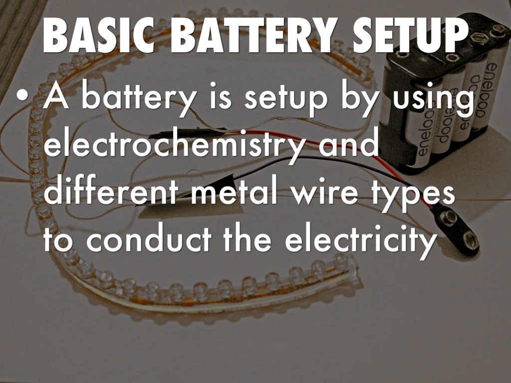 • A battery is setup by using electrochemistry and different metal wire types to conduct the electricity