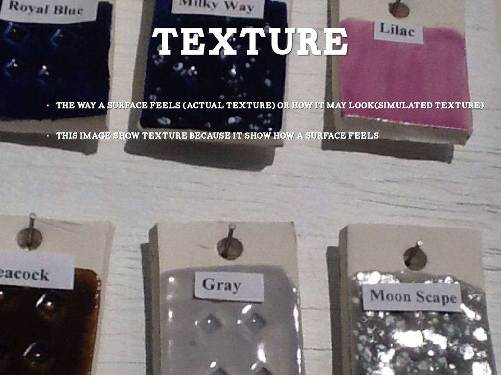 The way a surface feels (actual texture) or how it may look(simulated texture)