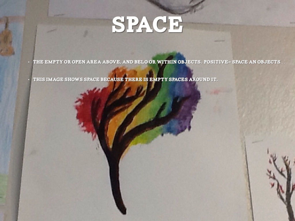 The empty or open area above, and belo or within objects. Positive- space an objects takes up. Negative- space around an objet