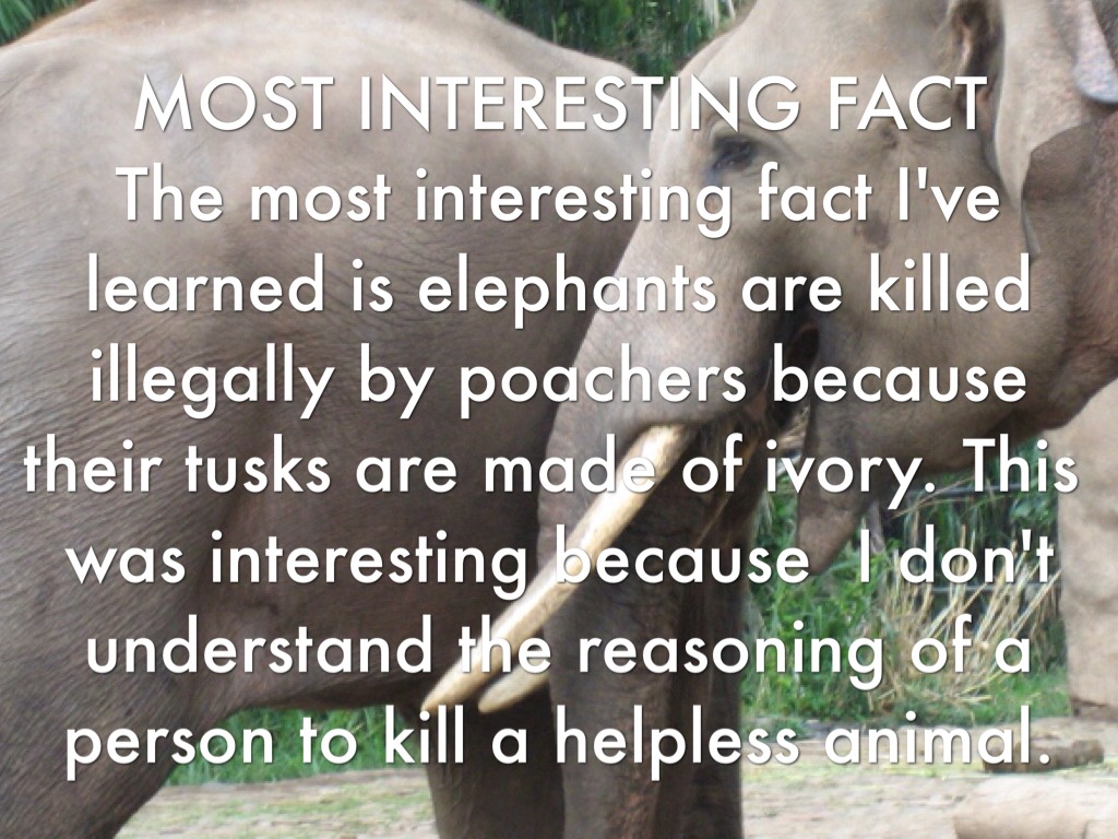 The most interesting fact I've learned is elephants are killed illegally by poachers because their tusks are made of ivory. This was interesting because I don't understand the reasoning of a person to kill a helpless animal.