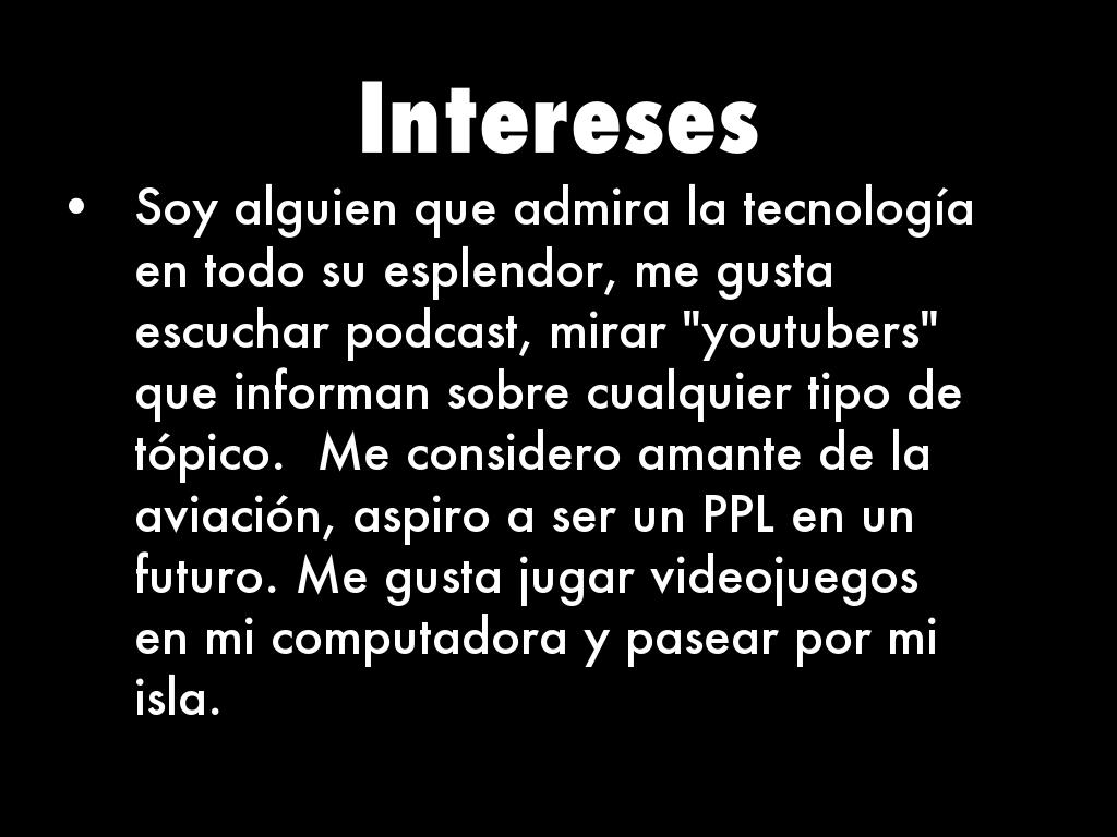 Soy alguien que admira la tecnología en todo su esplendor, me gusta escuchar podcast, mirar "youtubers" que informan sobre cualquier tipo de tópico. Me considero amante de la aviación, aspiro a ser un PPL en un futuro. Me gusta jugar videojuegos en mi computadora y pasear por mi isla.