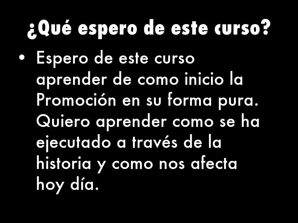 Espero de este curso aprender de como inicio la Promoción en su forma pura. Quiero aprender como se ha ejecutado a través de la historia y como nos afecta hoy día.