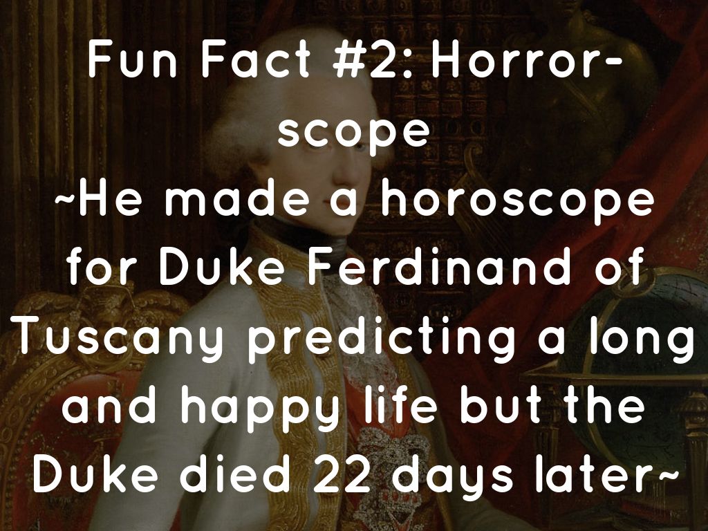 ~He made a horoscope for Duke Ferdinand of Tuscany predicting a long and happy life but the Duke died 22 days later~
