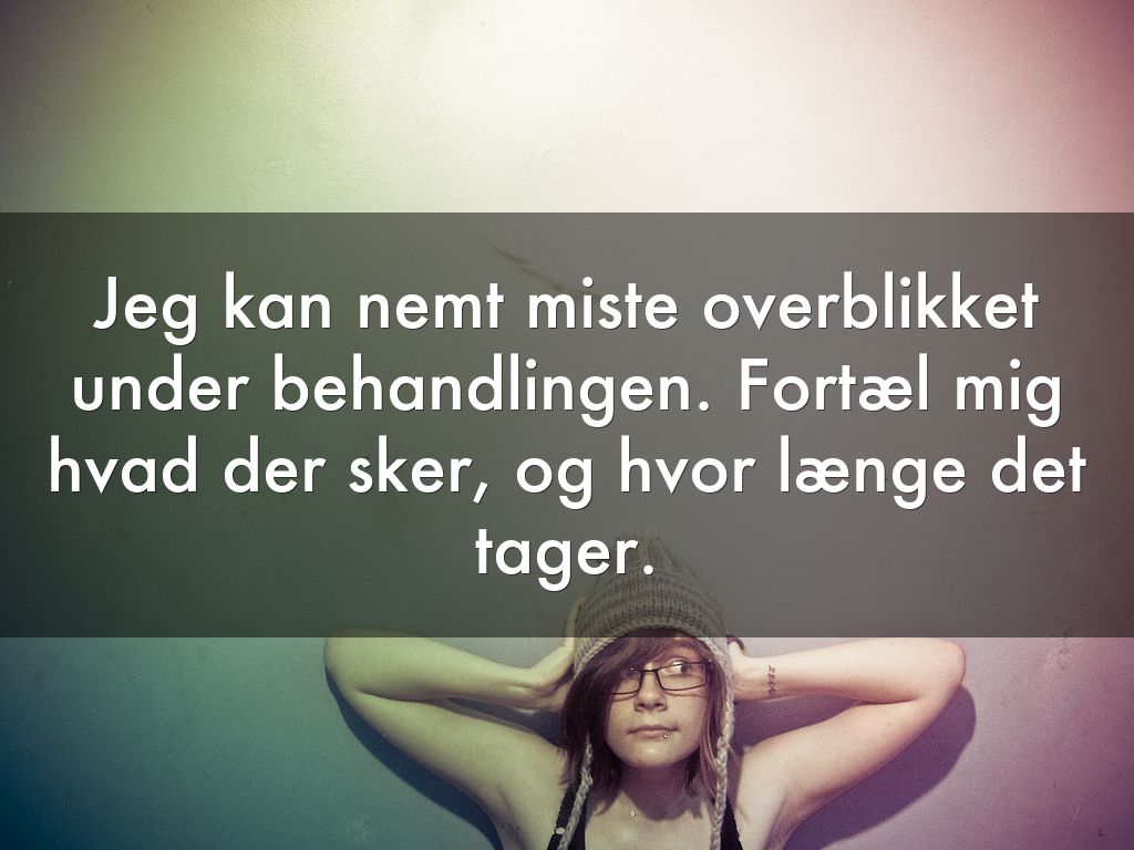 Jeg kan nemt miste overblikket under behandlingen. Fortæl mig hvad der sker, og hvor længe det tager.