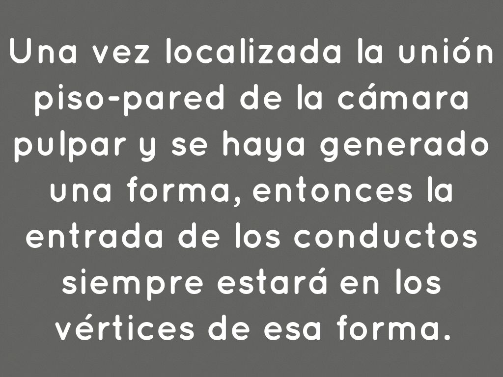 Una vez localizada la unión piso-pared de la cámara pulpar y se haya generado una forma, entonces la entrada de los conductos siempre estará en los vértices de esa forma.