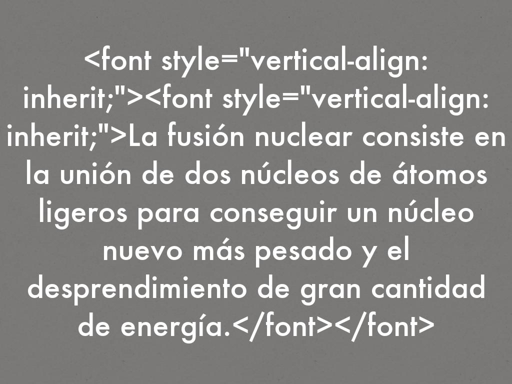 La fusión nuclear consiste en la unión de dos núcleos de átomos ligeros para conseguir un núcleo nuevo más pesado y el desprendimiento de gran cantidad de energía.