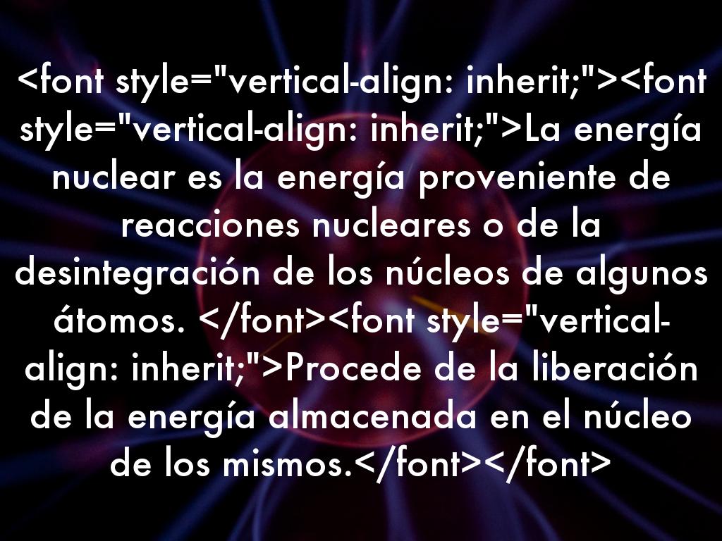 La energía nuclear es la energía proveniente de reacciones nucleares o de la desintegración de los núcleos de algunos átomos. Procede de la liberación de la energía almacenada en el núcleo de los mismos.