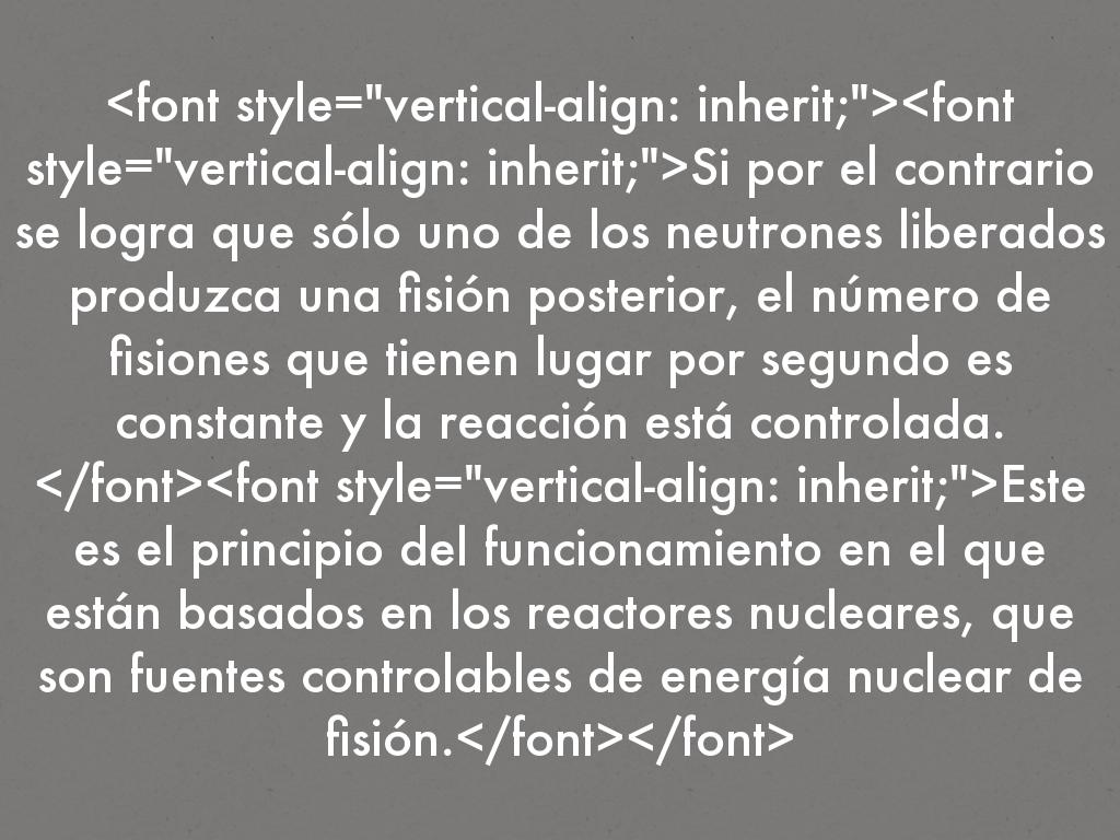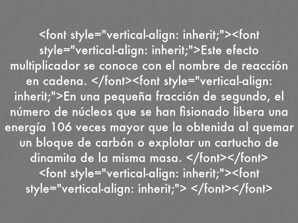Este efecto multiplicador se conoce con el nombre de reacción en cadena. En una pequeña fracción de segundo, el número de núcleos que se han fisionado libera una energía 106 veces mayor que la obtenida al quemar un bloque de carbón o explotar un cartucho de dinamita de la misma masa.