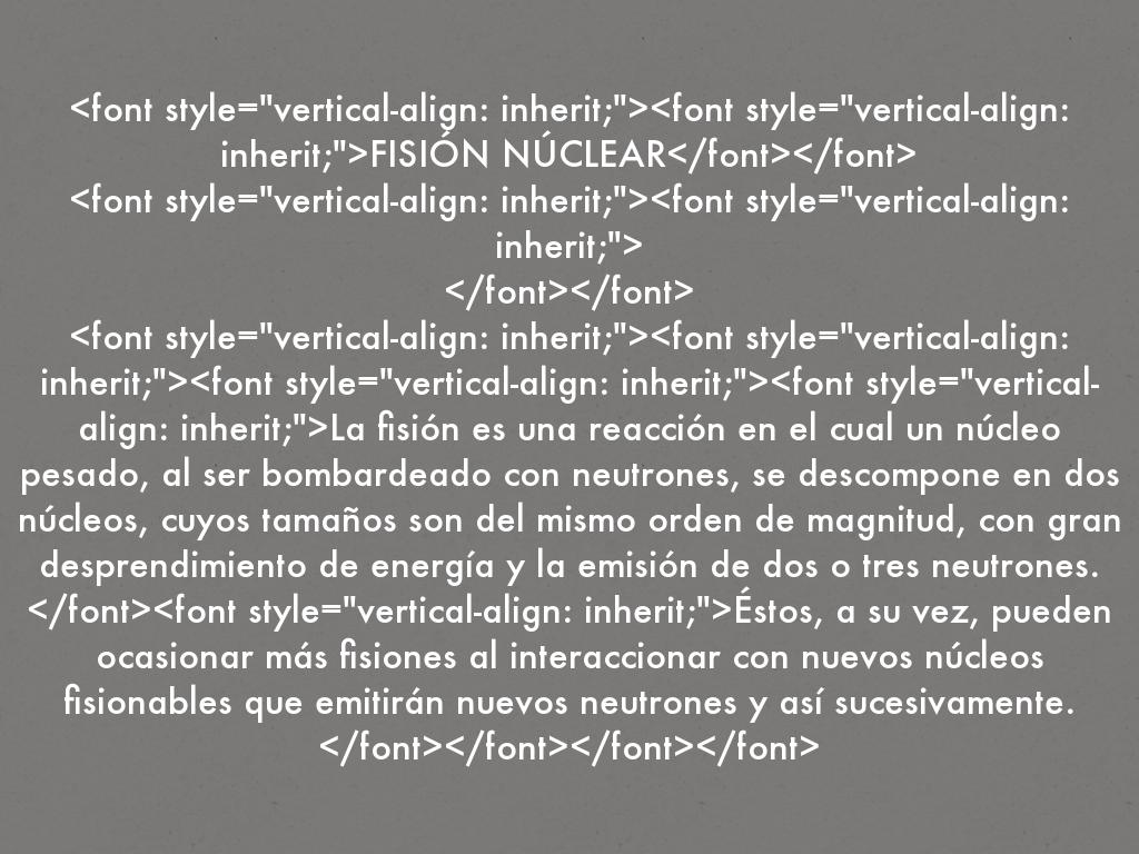 La fisión es una reacción en el cual un núcleo pesado, al ser bombardeado con neutrones, se descompone en dos núcleos, cuyos tamaños son del mismo orden de magnitud, con gran desprendimiento de energía y la emisión de dos o tres neutrones. Éstos, a su vez, pueden ocasionar más fisiones al interaccionar con nuevos núcleos fisionables que emitirán nuevos neutrones y así sucesivamente.