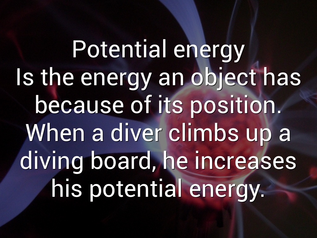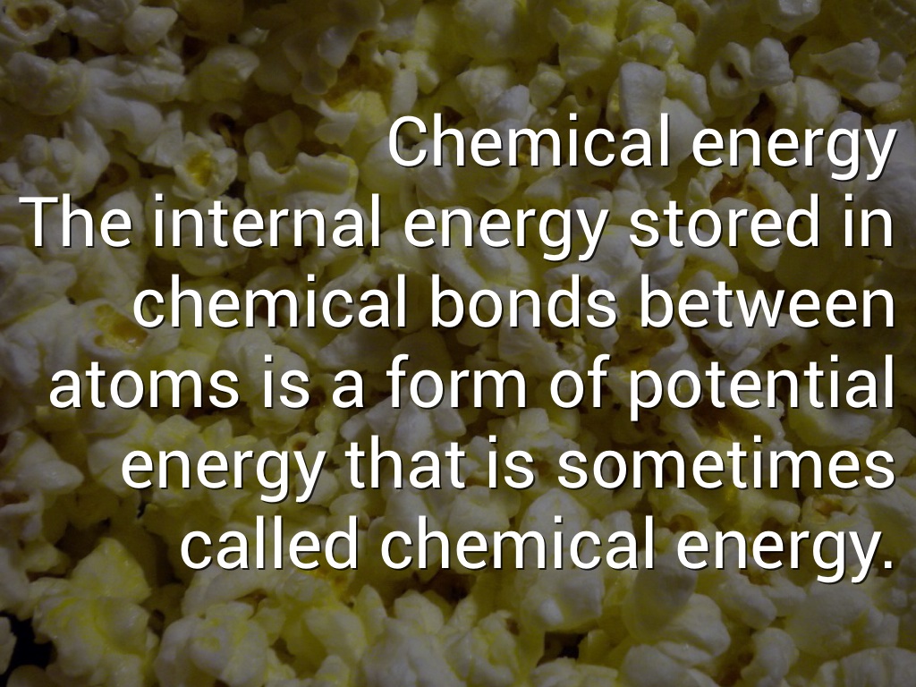The internal energy stored in chemical bonds between atoms is a form of potential energy that is sometimes called chemical energy.
