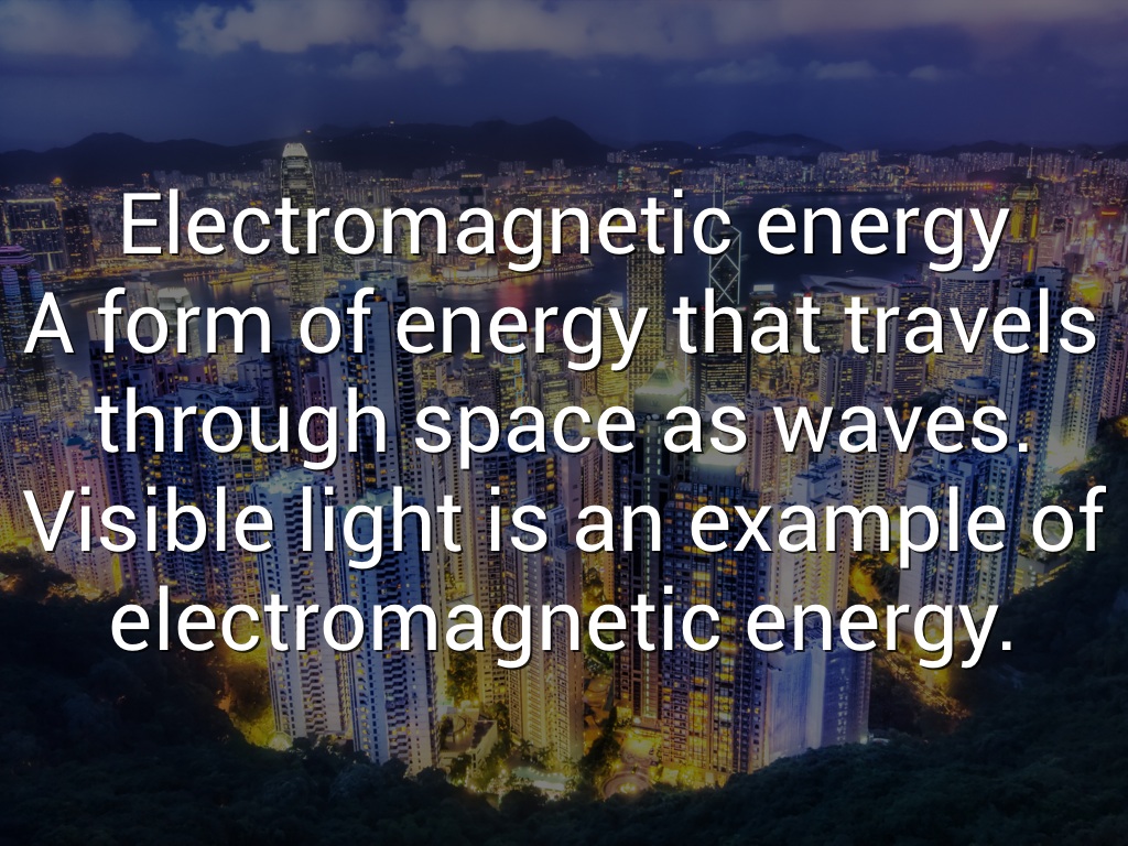 A form of energy that travels through space as waves. Visible light is an example of electromagnetic energy.