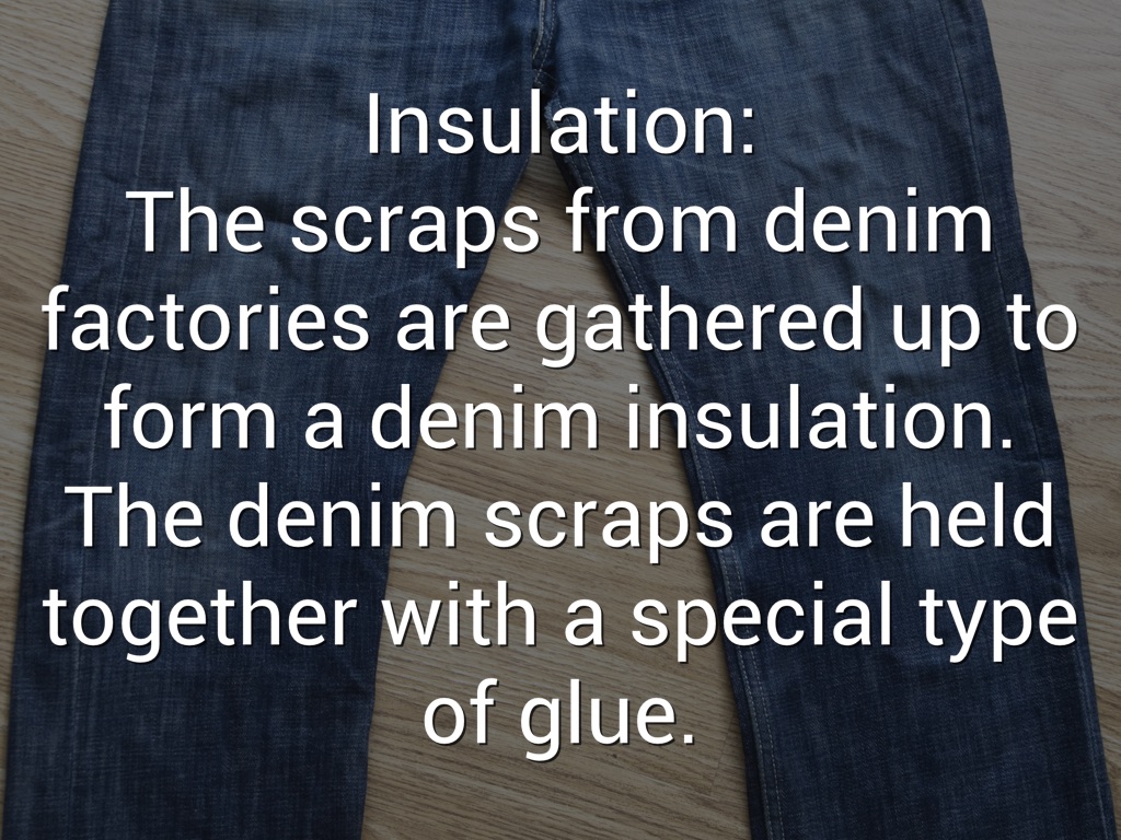 Insulation: The scraps from denim factories are gathered up to form a denim insulation. The denim scraps are held together with a special type of glue.