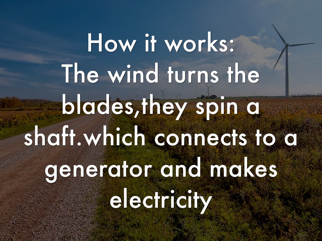 The wind turns the blades,they spin a shaft.which connects to a generator and makes electricity