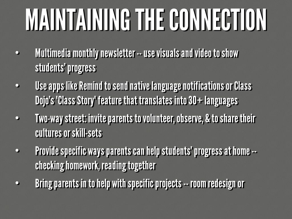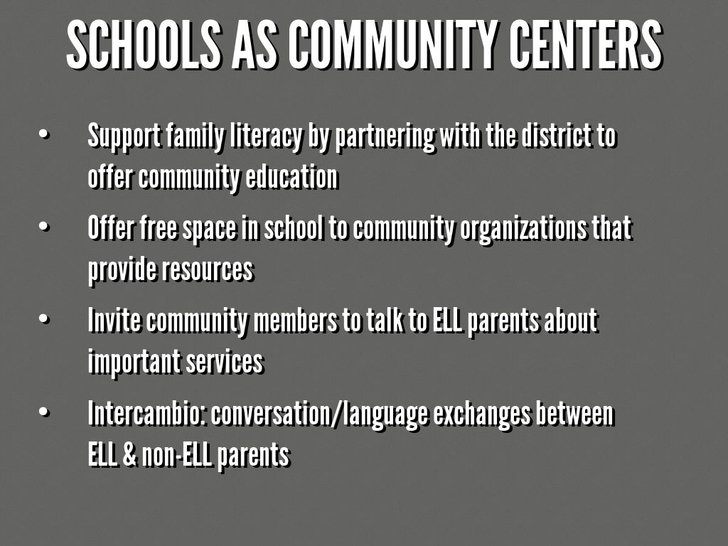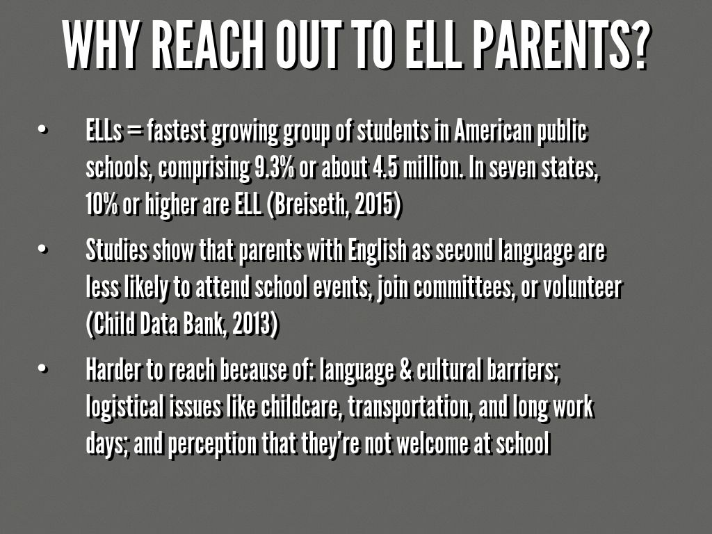 Studies show that parents with English as second language are less likely to attend school events, join committees, or volunteer (Child Data Bank, 2013)