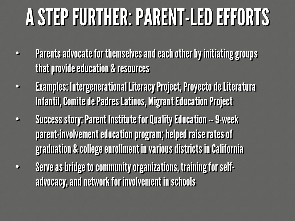Success story: Parent Institute for Quality Education -- 9-week parent-involvement education program; helped raise rates of graduation & college enrollment in various districts in California
