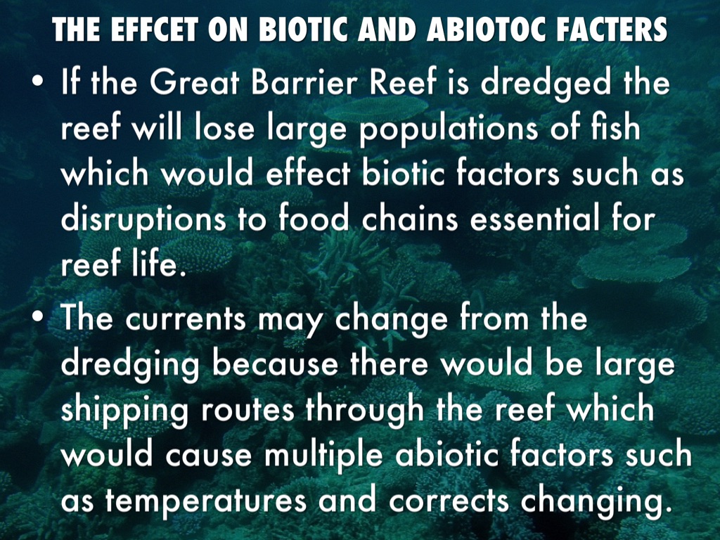 If the Great Barrier Reef is dredged the reef will lose large populations of fish which would effect biotic factors such as disruptions to food chains essential for reef life.