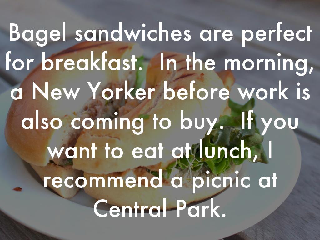 Bagel sandwiches are perfect for breakfast. In the morning, a New Yorker before work is also coming to buy. If you want to eat at lunch, I recommend a picnic at Central Park.