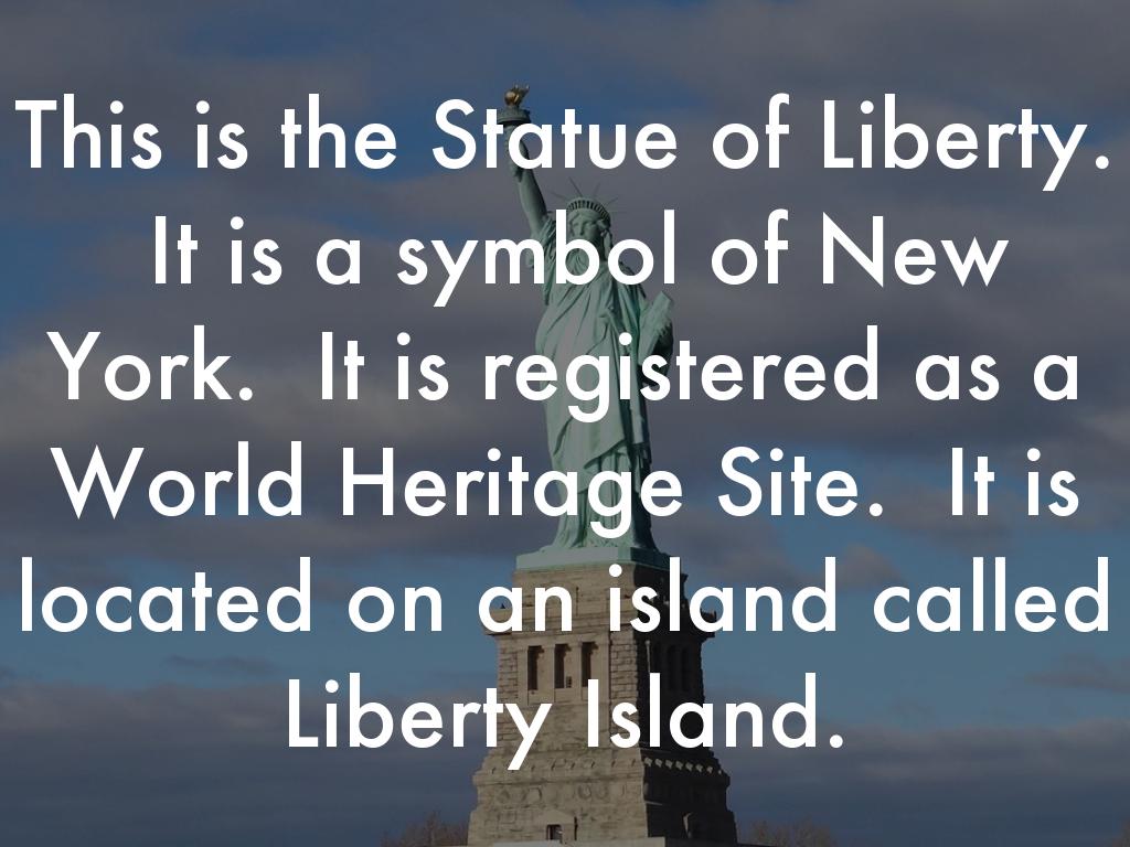 This is the Statue of Liberty. It is a symbol of New York. It is registered as a World Heritage Site. It is located on an island called Liberty Island.