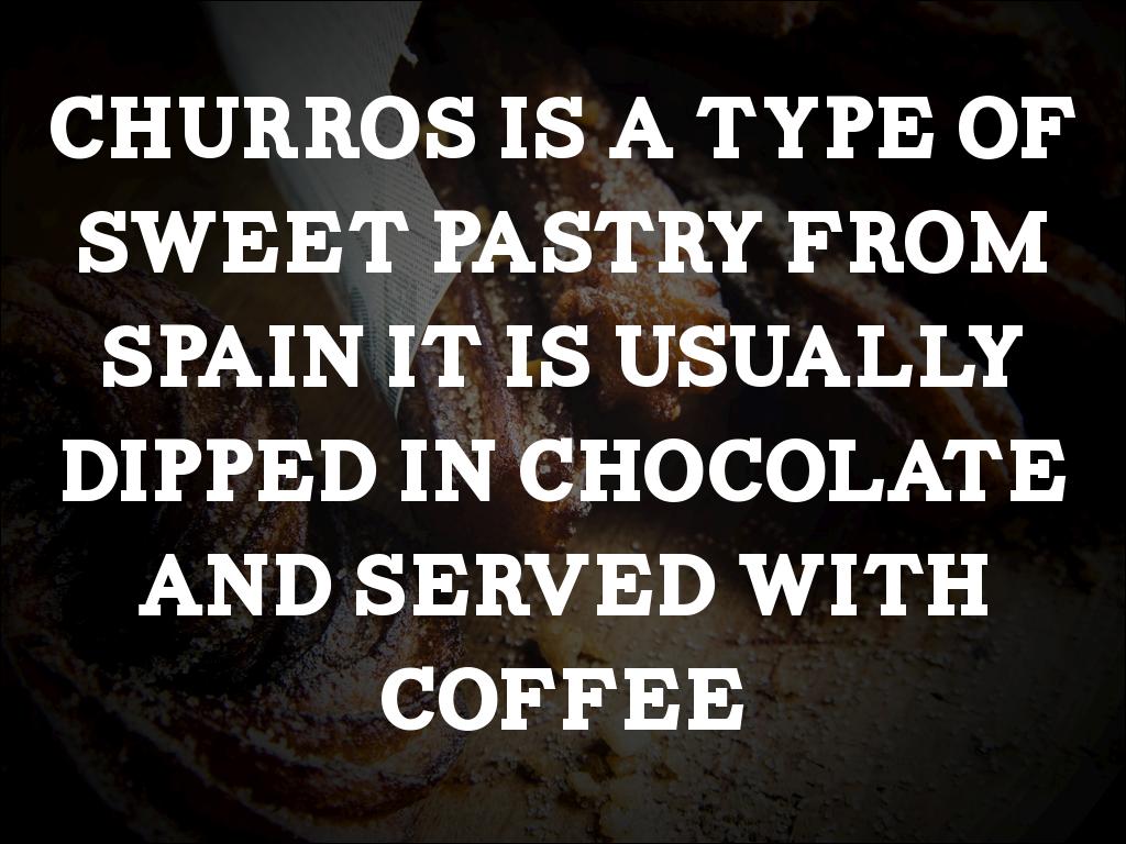 Churros is a type of sweet pastry from spain it is usually dipped in chocolate and served with coffee