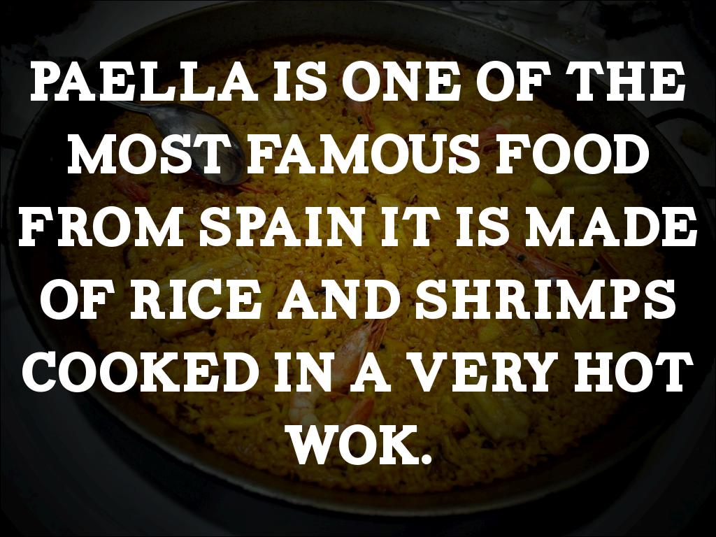 Paella is one of the most famous food from spain it is made of rice and shrimps cooked in a very hot wok.