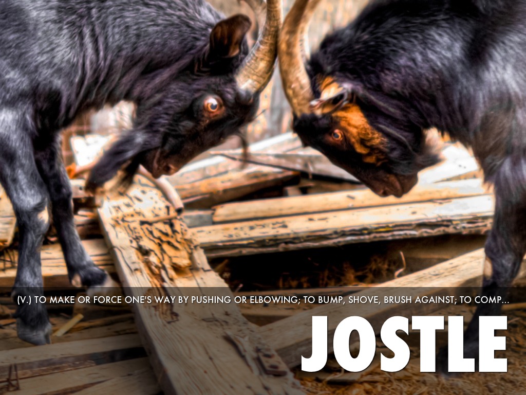 (V.) TO MAKE OR FORCE ONE'S WAY BY PUSHING OR ELBOWING; TO BUMP, SHOVE, BRUSH AGAINST; TO COMPETE FOR