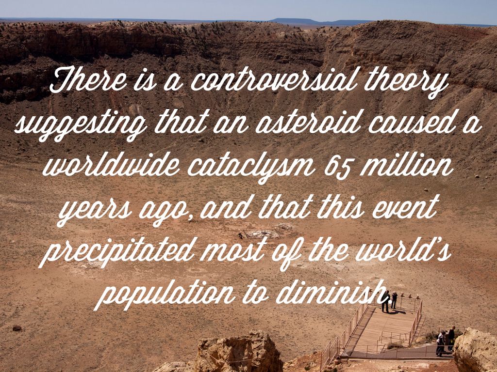 There is a controversial theory suggesting that an asteroid caused a worldwide cataclysm 65 million years ago, and that this event precipitated most of the world's population to diminish.