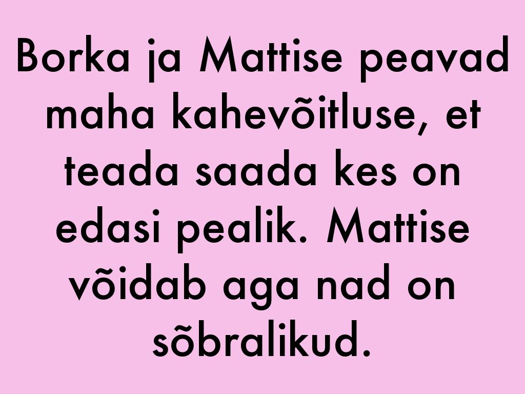 Borka ja Mattise peavad maha kahevõitluse, et teada saada kes on edasi pealik. Mattise võidab aga nad on sõbralikud.