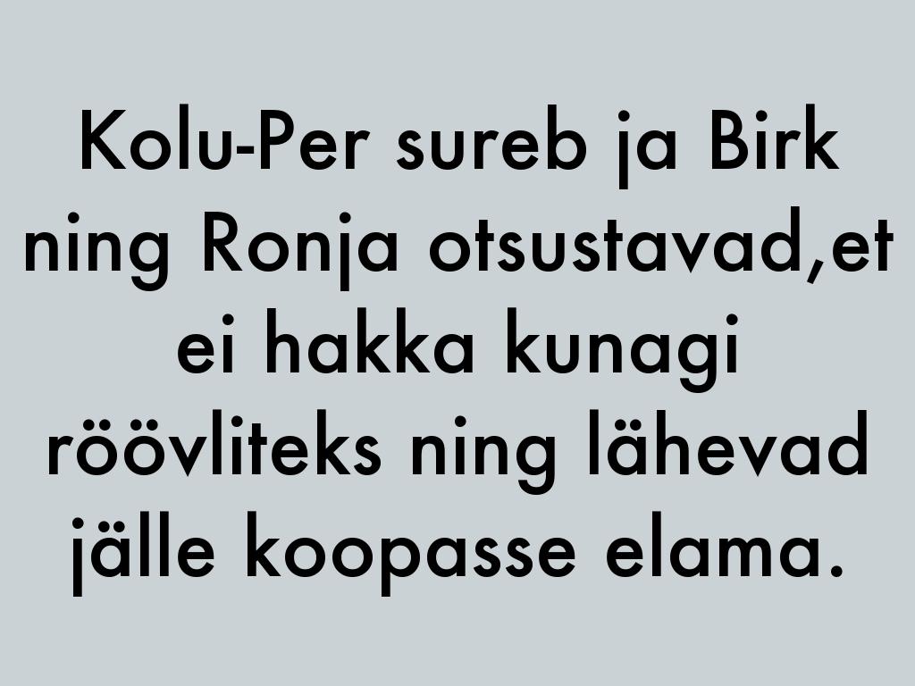 Kolu-Per sureb ja Birk ning Ronja otsustavad,et ei hakka kunagi röövliteks ning lähevad jälle koopasse elama.