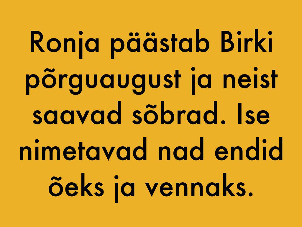 Ronja päästab Birki põrguaugust ja neist saavad sõbrad. Ise nimetavad nad endid õeks ja vennaks.