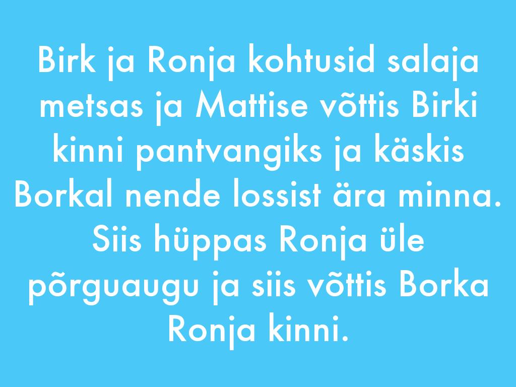 Birk ja Ronja kohtusid salaja metsas ja Mattise võttis Birki kinni pantvangiks ja käskis Borkal nende lossist ära minna.