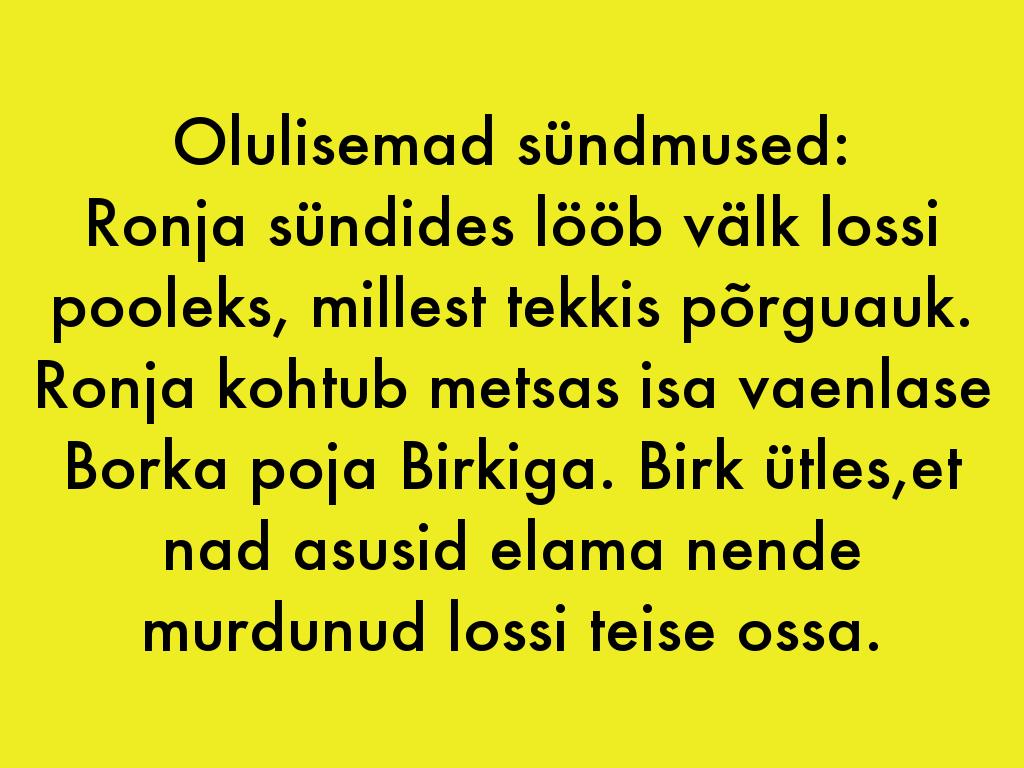 Ronja kohtub metsas isa vaenlase Borka poja Birkiga. Birk ütles,et nad asusid elama nende murdunud lossi teise ossa.