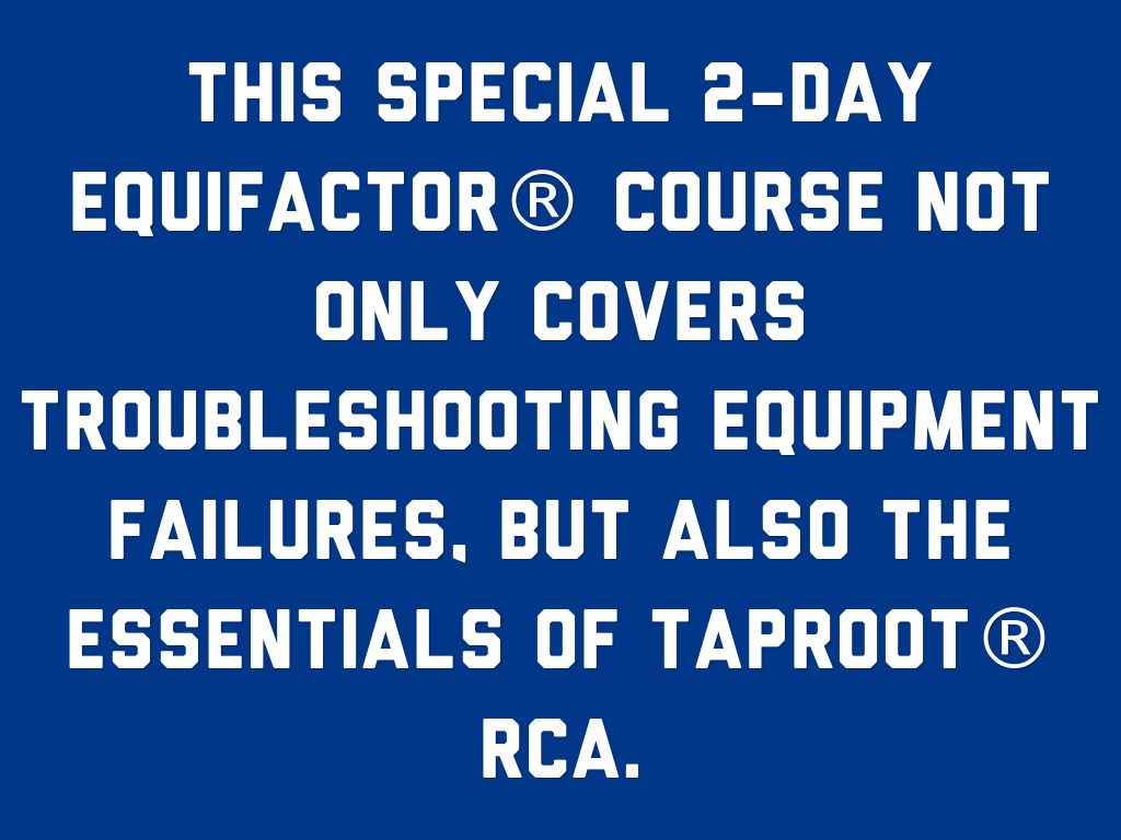 This special 2-day equifactor® course not only covers troubleshooting equipment failures, but also the Essentials of Taproot® rca.