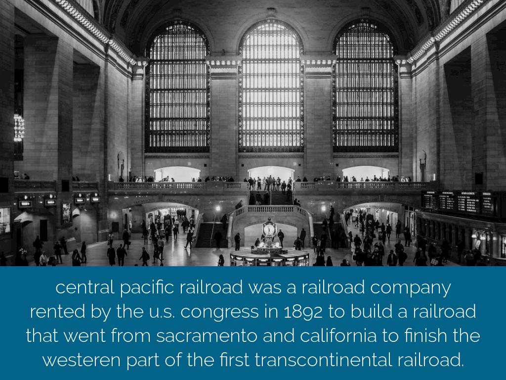 central pacific railroad was a railroad company rented by the u.s. congress in 1892 to build a railroad that went from sacramento and california to finish the westeren part of the first transcontinental railroad.