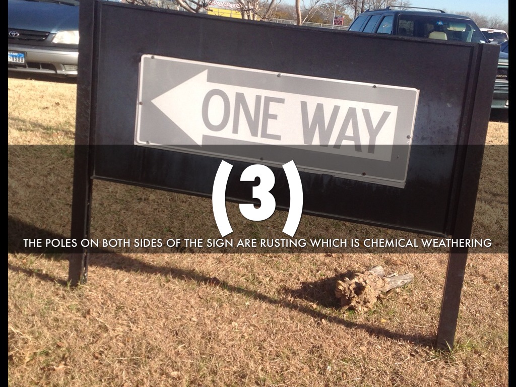 THE POLES ON BOTH SIDES OF THE SIGN ARE RUSTING WHICH IS CHEMICAL WEATHERING