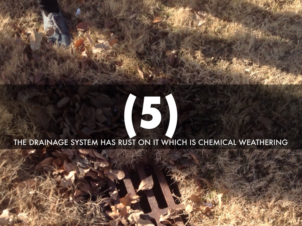 THE DRAINAGE SYSTEM HAS RUST ON IT WHICH IS CHEMICAL WEATHERING