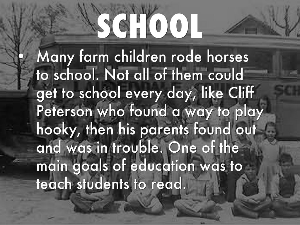 • Many farm children rode horses to school. Not all of them could get to school every day, like Cliff Peterson who found a way to play hooky, then his parents found out and was in trouble. One of the main goals of education was to teach students to read.