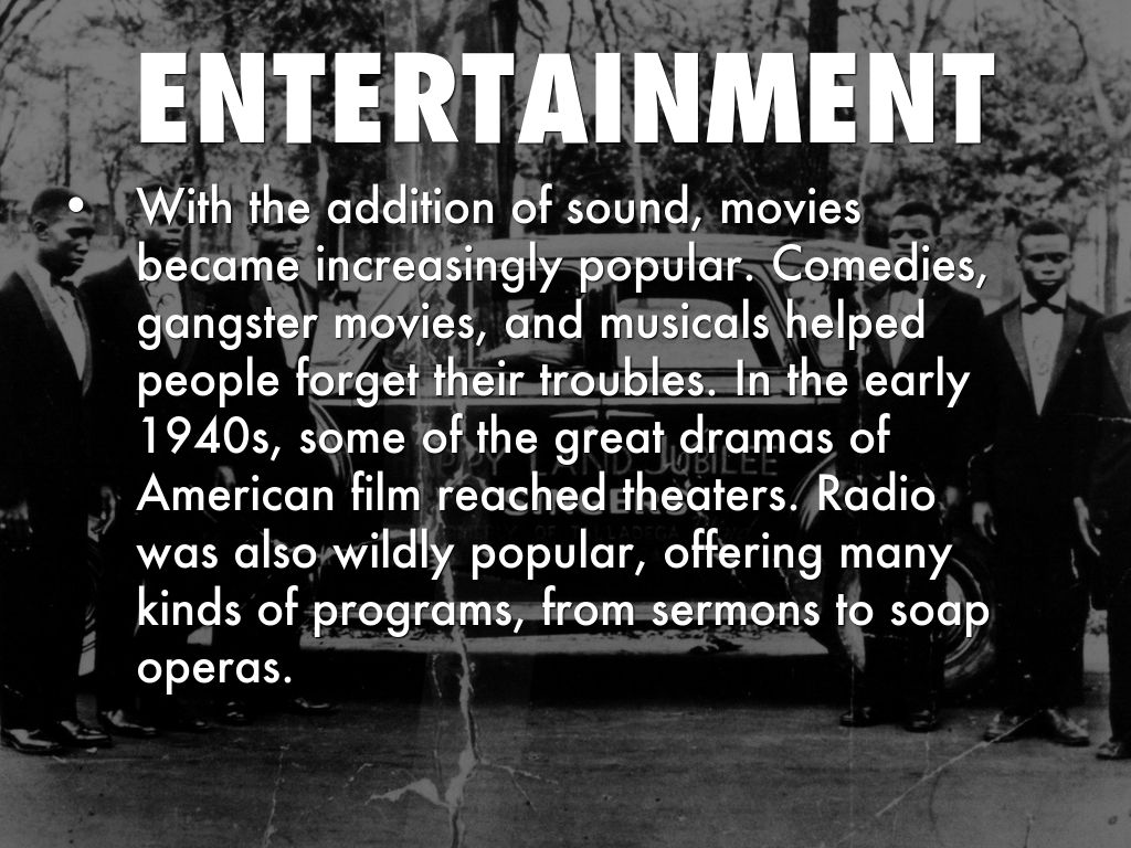 • With the addition of sound, movies became increasingly popular. Comedies, gangster movies, and musicals helped people forget their troubles. In the early 1940s, some of the great dramas of American film reached theaters. Radio was also wildly popular, offering many kinds of programs, from sermons to soap operas.